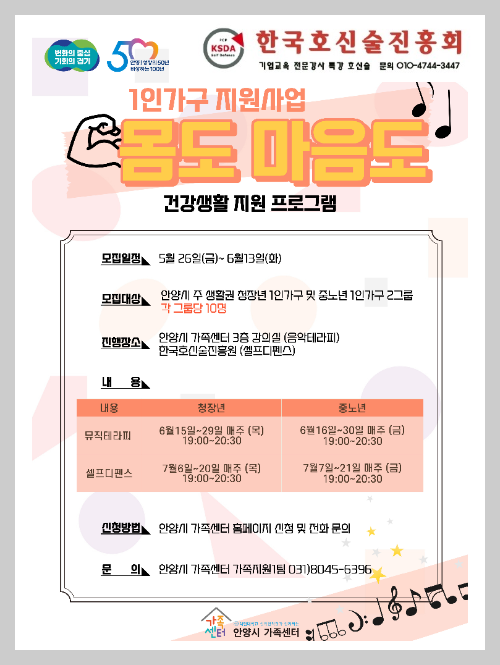 안양시 거주 청장년 및 중노년 1인 가구 대상으로 호신술 교육이 한국호신술진흥회에서 2023. 7. 6.~7. 21. 진행됩니다.