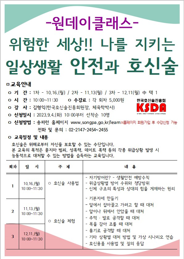 나를 지키는 일상생활 안전과 호신술 / 자기방어훈련 (송파구 평생학습원 2023. 10. 16./ 11. 13./ 12. 11.)